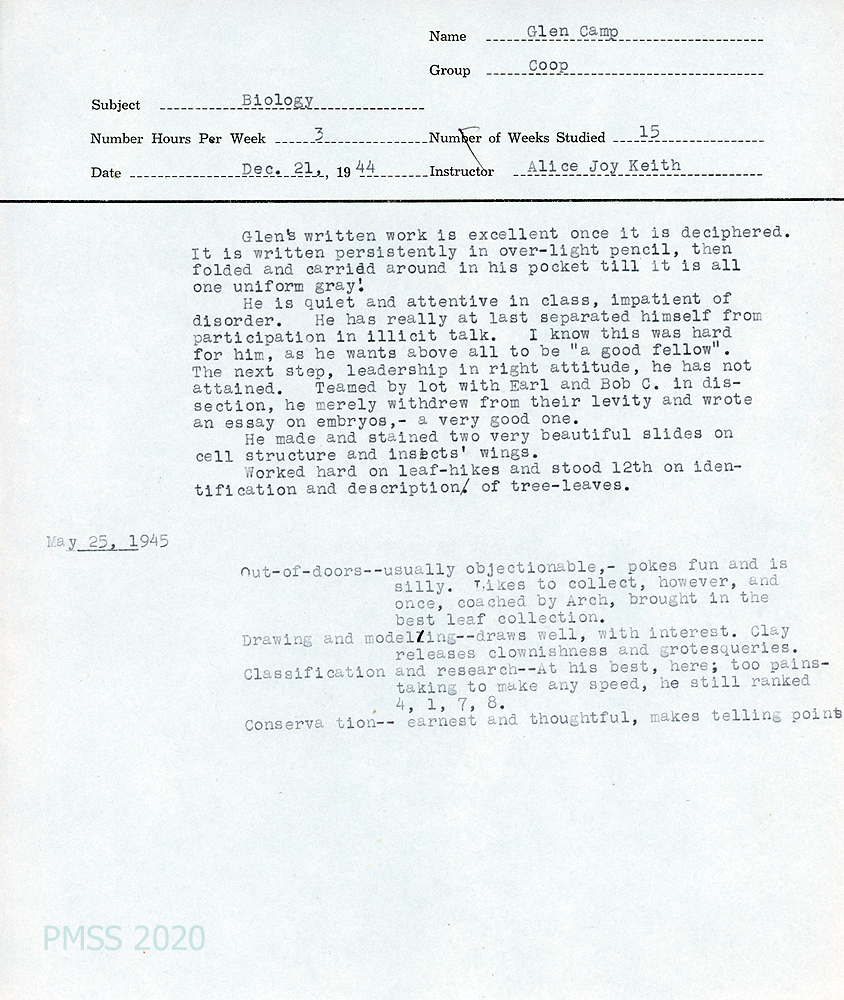 [031] December 21, 1944. Student evaluation by English teacher, M.M. Sparrow. “Glen is widely read for a boy of his years, has an unusual vocabulary, understands what he reads, gets the finer shadings of character, and sees below the mere surface of the story. He is a great asset to the literature class. In all our work no one makes a great effort than he to do every assignment perfectly, and he is quite unsparing in condemning himself for any mistakes he makes. He does excellent work and keeps growing. He has changed much from last year – is a very likable, unassuming boy, who makes his contributions to the class in a modest way. I thoroughly enjoy having him in class.”
