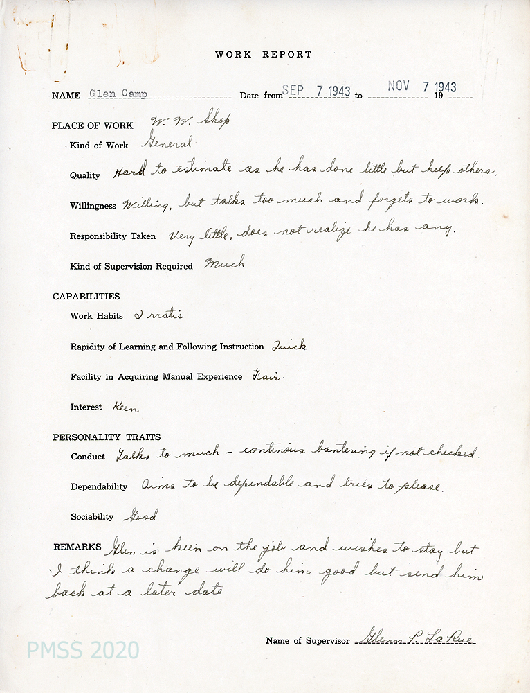 [041] September 7 – November 7, 1943. Student appraisal by supervisor of the Woodworking Shop, Glenn P. LaRue.