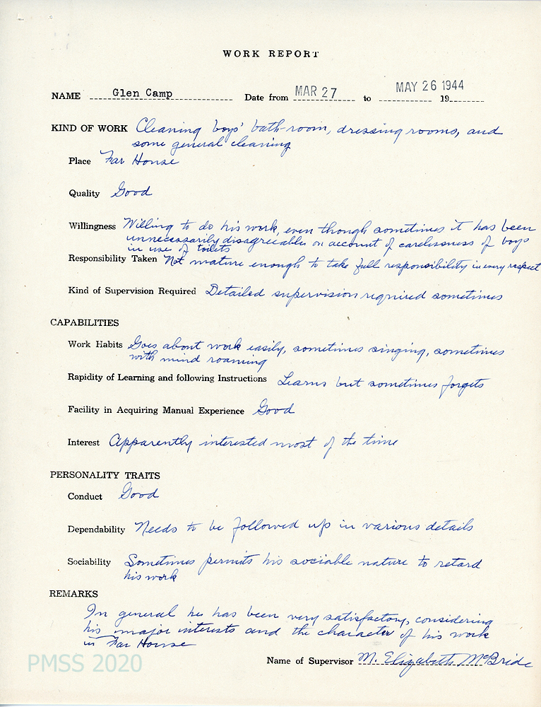 [044] March 27 – May 26, 1944. Student appraisal by M. Elizabeth McBride, supervisor of Far House cleaning. “Sometimes permits his sociable nature to retard his work.”
