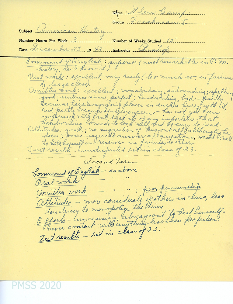 [054] December 23, 1943. Student evaluation by the American History teacher, “Bishop.” “Command of English: superior (most remarkable in P.M. history, as I know it. … Efforts: Unceasing, always out to beat himself, never content with anything less than perfection.”