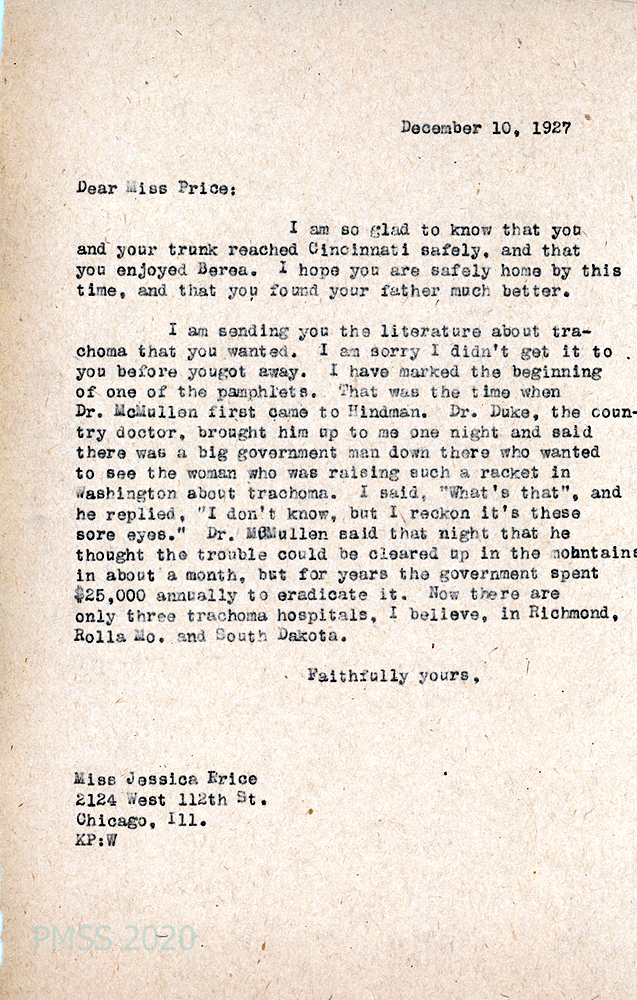 [017] December 10, 1927. To Miss Price in Chicago from KP (Pettit), who sends hope that Jessica’s father is better; encloses literature about trachoma that she requested. Tells a story about Dr. McMullen at Hindman; Dr. Duke, the country doctor. “Now there are only three trachoma hospitals” in the country.