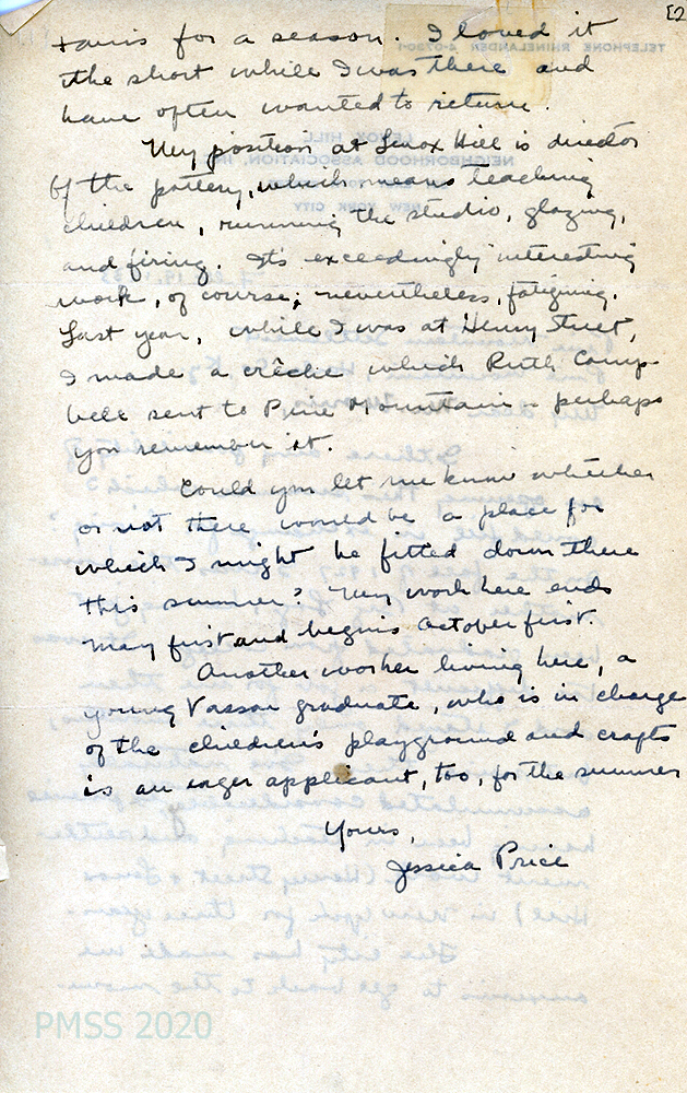 TAGS: Jessica Price correspondence, PMSS staff, housemothers, artists, applications for PMSS employment, Denison University, Big Log housemothers, references, Lenox Hill Neighborhood Association, Henry Street Settlement, Polly Wilder, Rev. James Morse