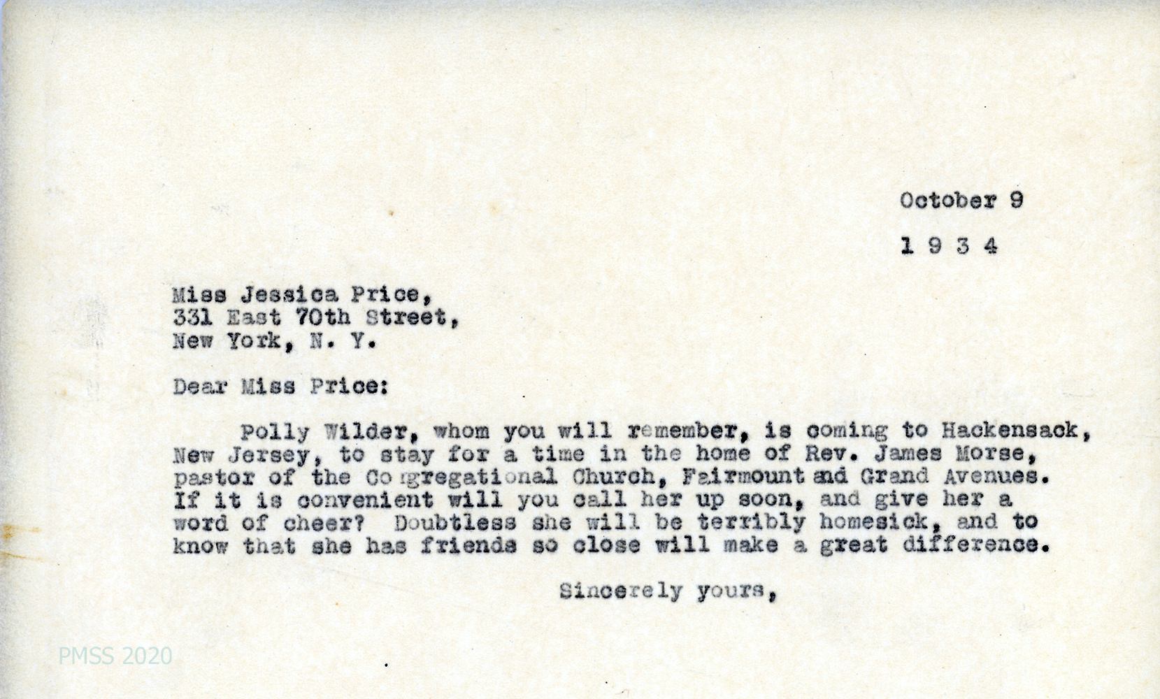 [020] October 9, 1934. To Price from [unsigned], who asks her to visit Polly Wilder who is coming to Hackensack, NJ, to stay at the home of Rev. James Morse, pastor of the Congregational Church. “Doubtless she will be terribly homesick, and to know that she has friends so close will make a great difference.”
