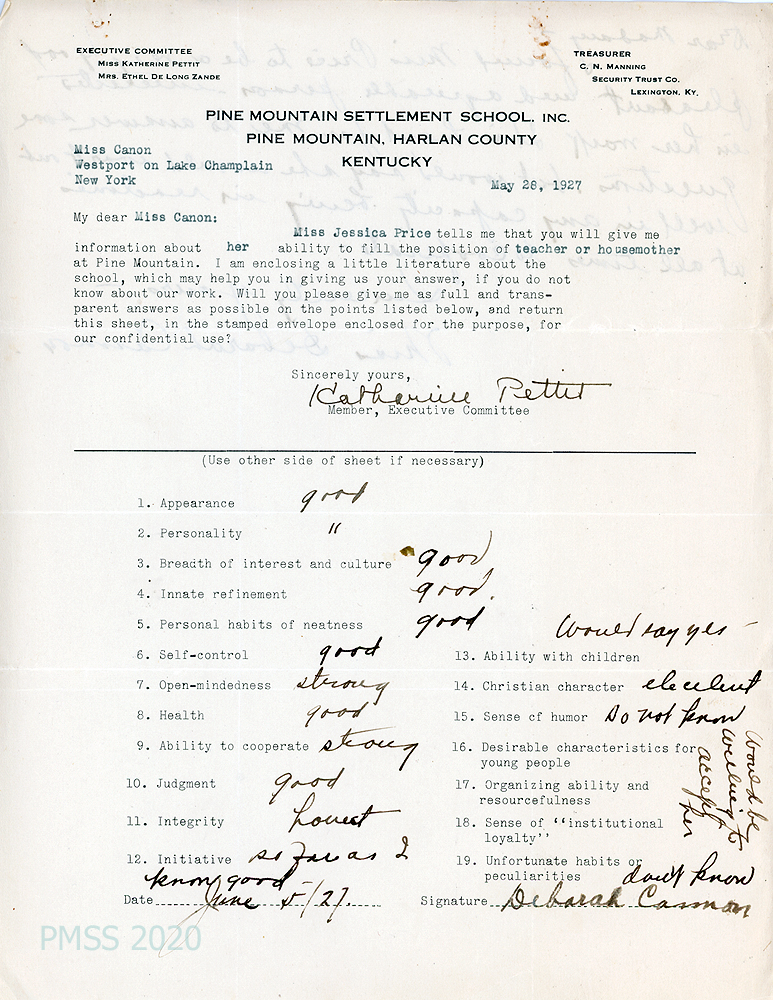 [002] June ?, 1927. To Katherine Pettit of the PMSS Executive Committee from Miss Deborah Canon, Westport, NY. Canon provides handwritten entries on a two-sided form (sent to her by Pettit on May 28) concerning Jessica’s ability to fill a teacher or housemother position at PMSS.