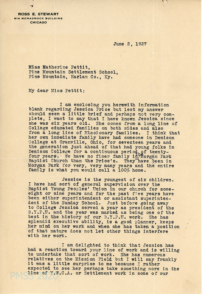 [006], [006a] June 2, 1927. Two-page typewritten letter to Miss Katherine Pettit from Ross E. Stewart, Chicago, IL, [006] who encloses his reference form for Jessica. “She comes from a long line of college educated families on both sides and also from a long line of missionary families.” He tells of her family’s longtime association with Denison College; that she is the youngest of six children. “We have no finer family in the Morgan Park Baptist Church than the Price[s]. They have been in Morgan Park for very, very many years….” Just before college, Jessica was president of the Baptist Young Peoples’ Union (BYPU) and that year was “one of the best in the history of BYPU work. She has splendid executive ability, is a good planner, keeps her mind on her work….” [006a] “Her manners are simple and plain, as is her dress, but refinement in the extreme.”