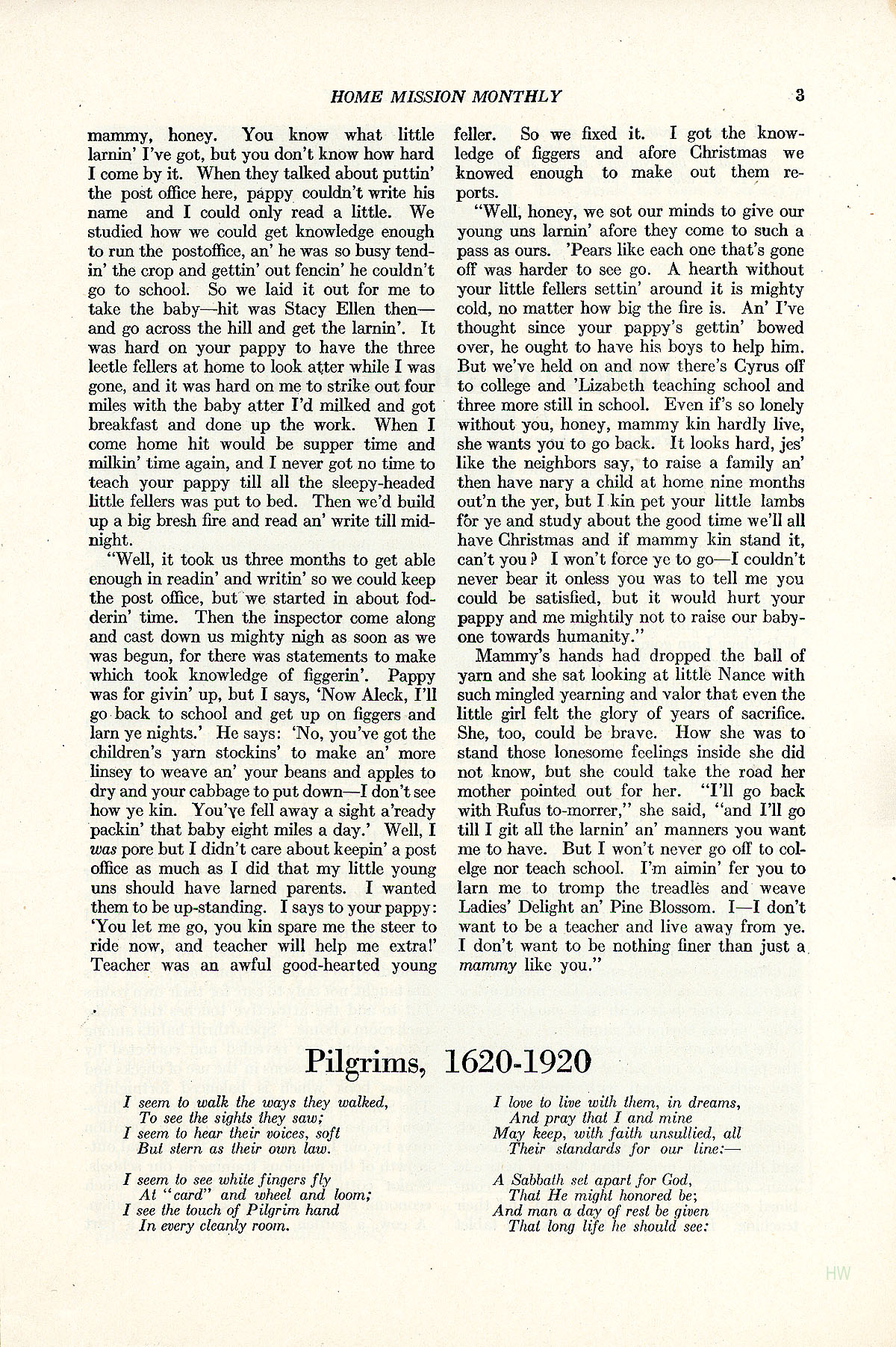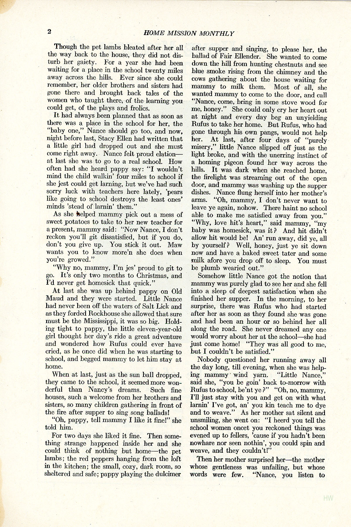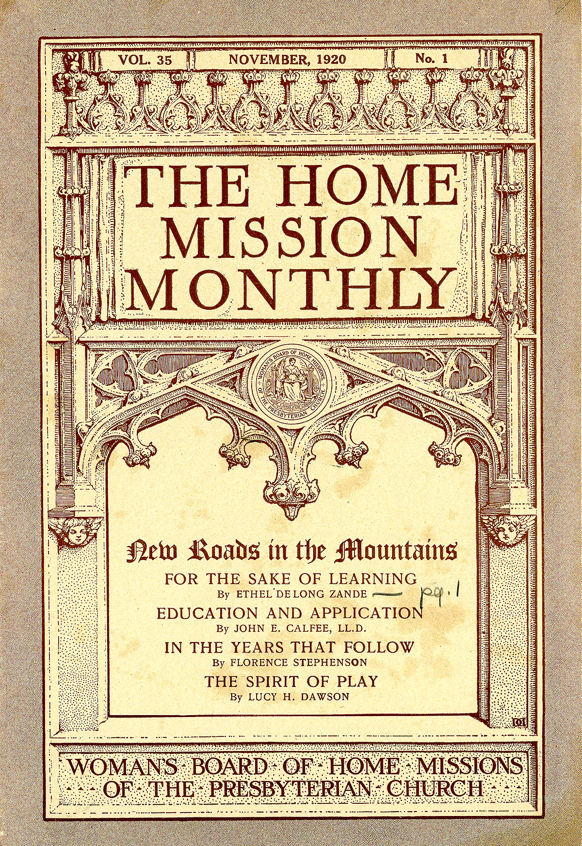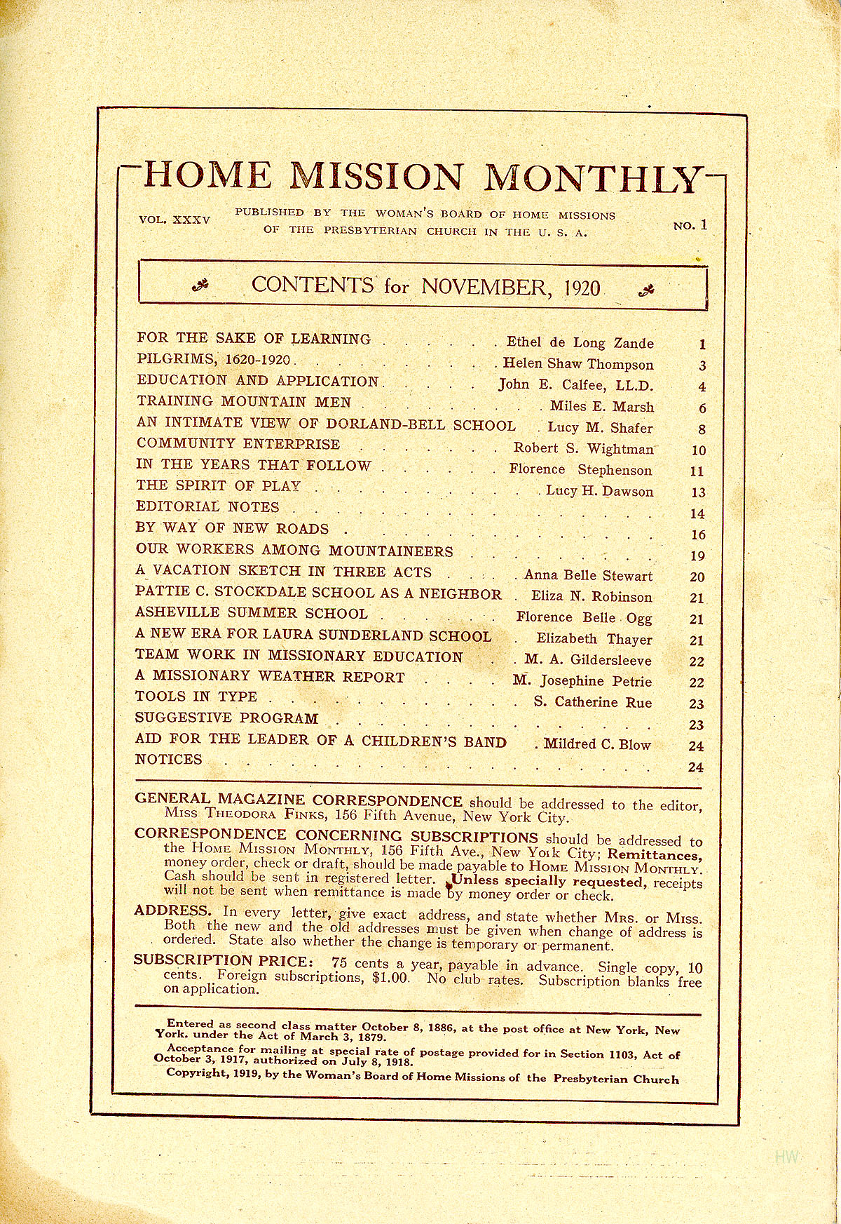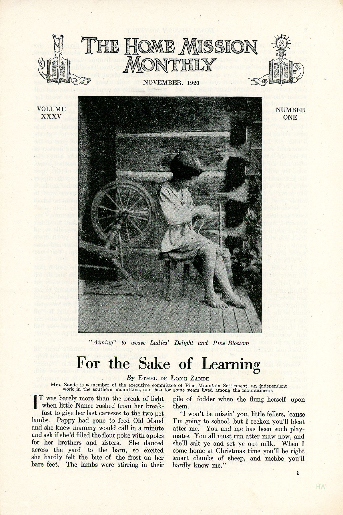 Zande, Ethel de Long. “FOR THE SAKE OF LEARNING.” Home Mission Monthly, Vol. XXXV, Issue 1. Nov 1920, p. 1. Reprinted in the Quarterly Magazine of the Southern Industrial Educational Association, Vol. XIII, Nos. 1 & 2. March and June 1921, pp. 3-7.
