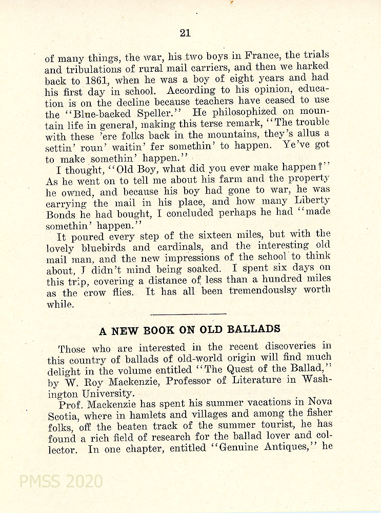 Ethel de Long Zande, as the new educational director at Pine Mountain Settlement School, makes a persuasive and poignant argument for a balance of both the deep culture endemic in Appalachia and the need for “book larnin'” to keep pace with the changing world. Zande’s article made a profound impact on other educators and other schools in the Appalachians. It was re-published in the March and June 1921 issue of Quarterly Magazine of the Southern Industrial Educational Association (pages 3-7), in a longer form shortly after appearing in the Home Mission Monthly journal. Zande’s ideas and observations joined a growing educational perspective from a variety of other educators and organizations.