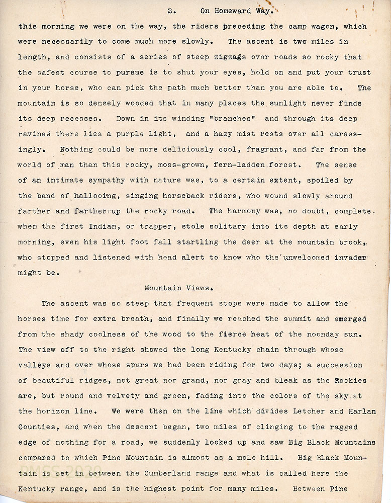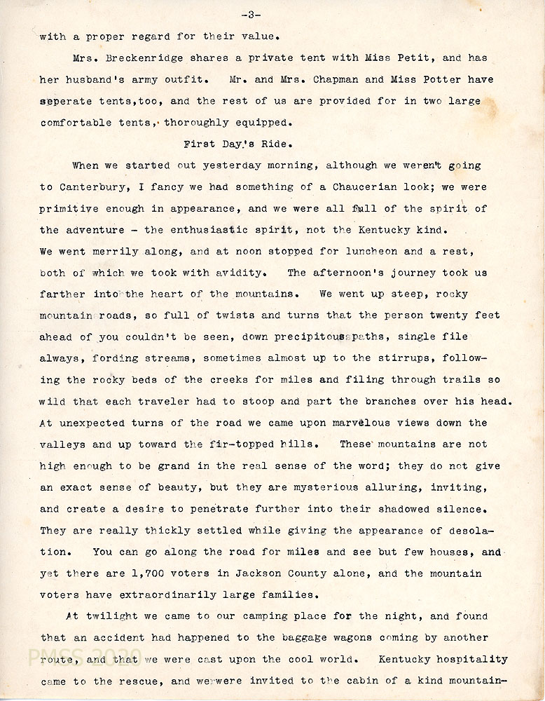 TAGS: Pine Mountain Settlement School history, Maria McVay, Berea College excursion by horseback, Kentucky mountains, Harlan County, Letcher County, Cumberland River, Big Black Mountain, horses, camping, Katherine Pettit, Madeline McDowell Breckenridge, Desha Breckenridge, Rev. Henry Mixter Penniman, Colonel C.E. Sprague, Mrs. Sprague and daughter Beatrice, Nellie Semple [Ellen Churchill Semple], Ethel Wilder, Edwin Wilder, Dwight Bowers, Edward A Bowers [?], B. Wood Davis, Julia Wallace, Julia J. Freeborn, Mr. and Mrs. F.H. Chapman, Miss M.G. Potter [N.Y. lawyer], Jesse Frank James, Rev. G.W. Stearns, Jackson County