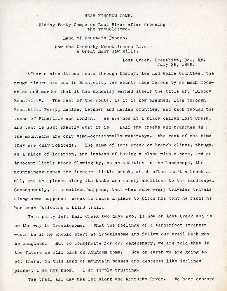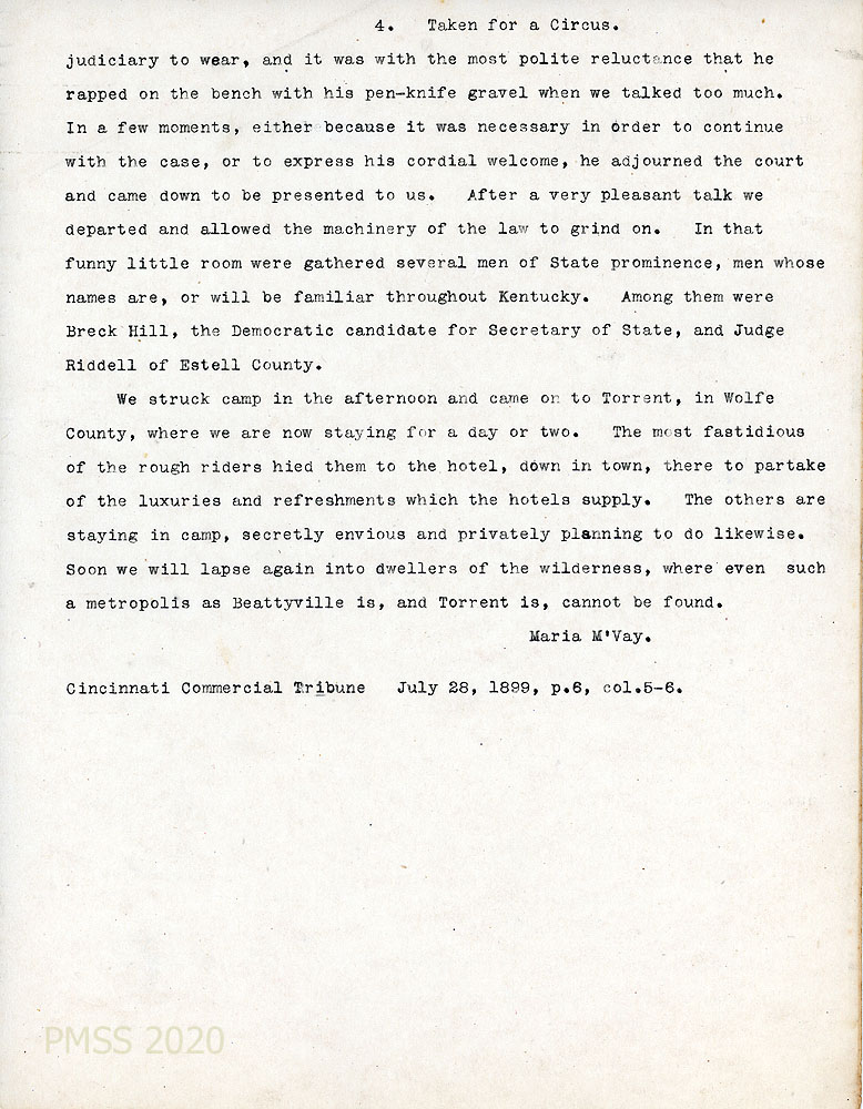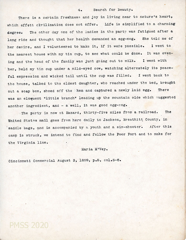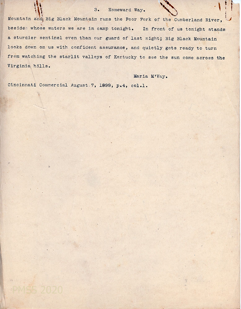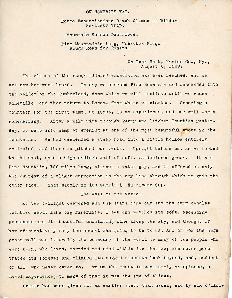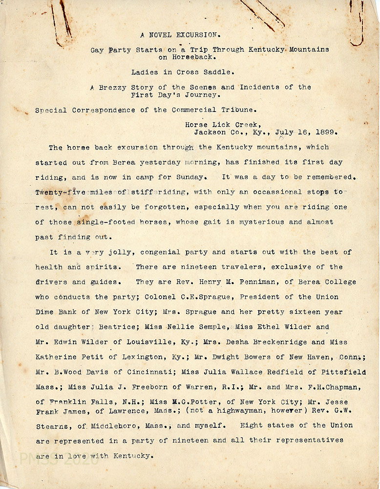 The following serialized news report by McVay stands in contrast to the scholarly work of Ellen Churchill Semple. The young Maria McVay describes the journey in very personal terms as it followed the organized itinerary in July 1899. Led by Rev. Henry M. Penniman of Berea College, the group of nineteen travelers and their drivers and guides was large but the young Miss McVay, one of the youngest of the group, had a sharp eye and ear and she noted that the nineteen individuals represented eight states and was held together by the shared sentiment that all of those present “are in love with Kentucky.”