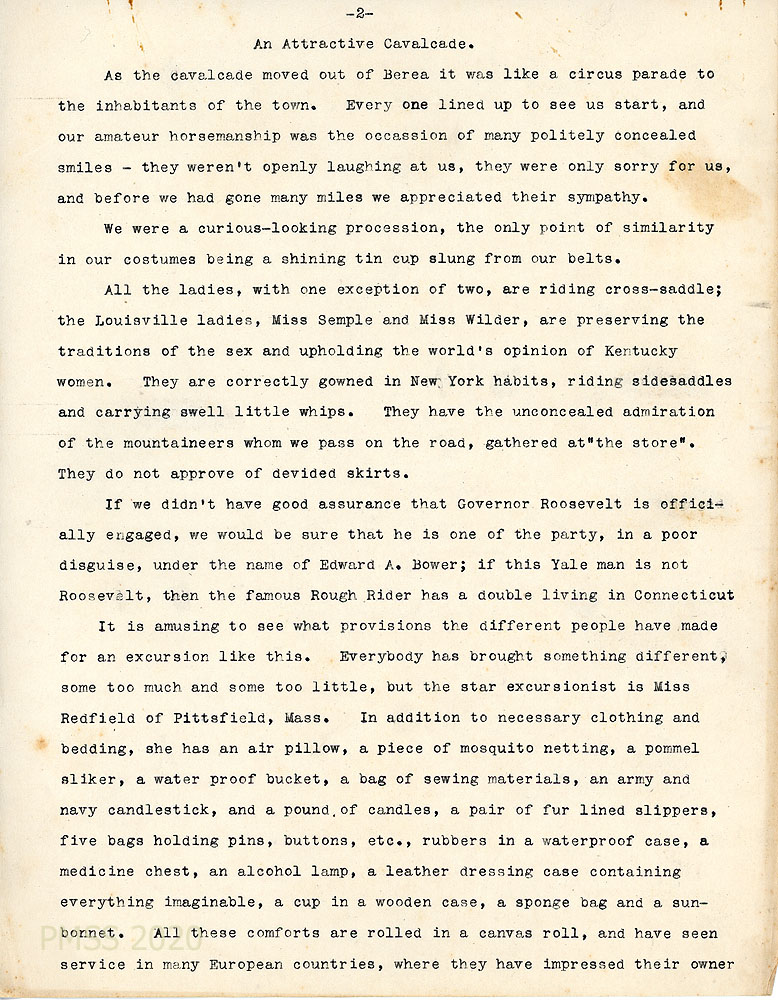 The horseback excursion through the Kentucky mountains, which started out from Berea yesterday morning, has finished its first day riding, [and] is now in camp for Sunday. It was a day to be remembered. Twenty-five miles of stiff riding, with only occasional stops to rest can not easily be forgotten, especially when you are riding one of those single-footed horses, whose gait is mysterious and past finding out.