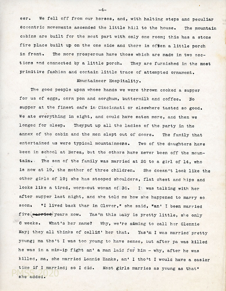 The good people upon whose hands we were thrown cooked a supper for us of eggs, corn pone and sorghum, buttermilk and coffee. No supper at the finest cafe in Cincinnati or elsewhere tasted so good. We ate everything in sight and could have eaten more, and then we longed for sleep. They put up all the ladies of the party in the annex of the cabin and the men slept out of doors. The family that entertained us were typical mountaineers. Two of the daughters have been in school at Berea, but the others have never been off the mountain. The son of the family was married at 20 to a girl of 14, who is now at 19 the mother of three children. She doesn’t look like the other girls of 19; she has stooped shoulders, flat chest and hips and looks like a tired, worn-out woman of 30. I was talking with her after supper last night, and she told me how she happened to marry so soon. “I lived back thar in Clover,” she said, “an’ I been married five years now. Yas ‘m, this baby is pretty little, she only 8 weeks.” What’s her name? “Why, we’re aiming to call her Glennie May; they all thinks of callin’ her that. Yas’m, I was married pretty young; ma tho’t I was too young to have sense, but after pa was killed –he was in a mix-up fight an’ a man laid for him — why, after he was killed, ma, she married Lonnie Hanks, an’ I tho’t I would have a easier time if I married; so I did. Most girls marries as young as that,” she added.