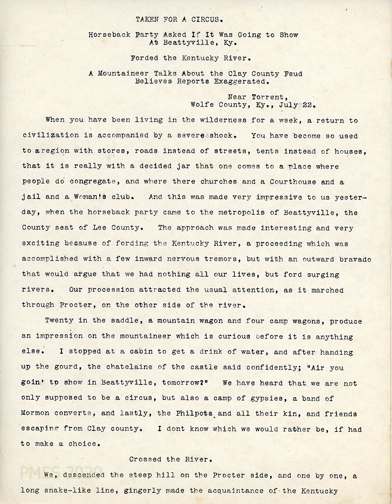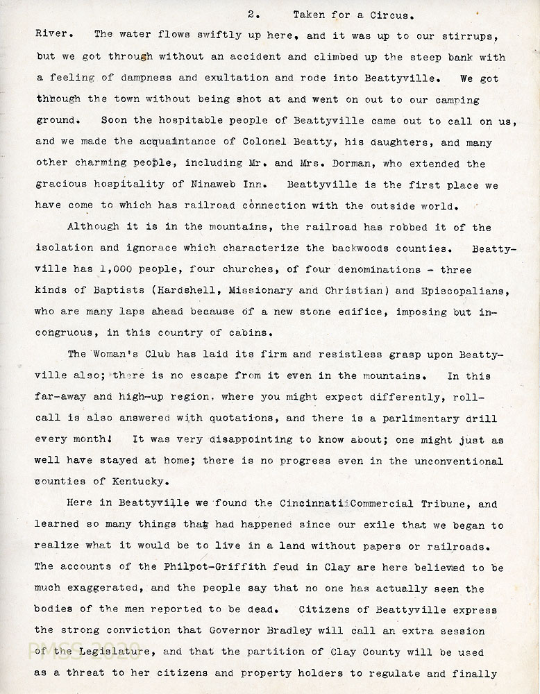 …River. The water flows swiftly up here, and it was up to our stirrups, but we got through without an accident and climbed up the steep bank with a feeling of dampness and exultation and rode into Beattyville. We got through the town without being shot at and went on out to our camping ground. Soon the hospitable people of Beattyville came out to call on us, and we made the acquaintance of Colonel Beatty, his daughters, and many other charming people, including Mr. and Mrs. Dorman, who extended the gracious hospitality of Ninaweb Inn. Beattyville is the first place we have come to which has [a] railroad connection with the outside world.