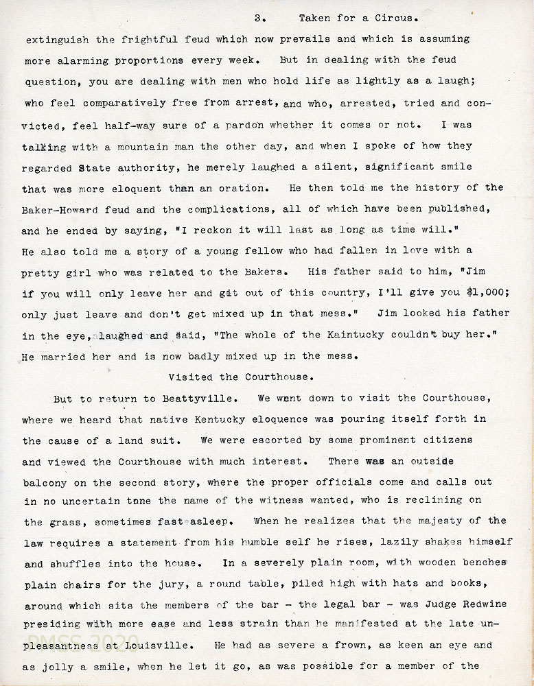 Here in Beattyville we found the Cincinnati Commercial Tribune, and learned so many things that had happened since our exile that we began to realize what it would be to live in a land without papers or railroads. The accounts of the Philpot-Griffith feud in Clay are here believed to be much exaggerated, and the people say that no one has actually seen the bodies of the men reported to be dead. Citizens of Beattyville express the strong conviction that Governor Bradley will call an extra session of the Legislature, and that the partition of Clay County will be used as a threat to her citizens and property holders to regulate and finally…