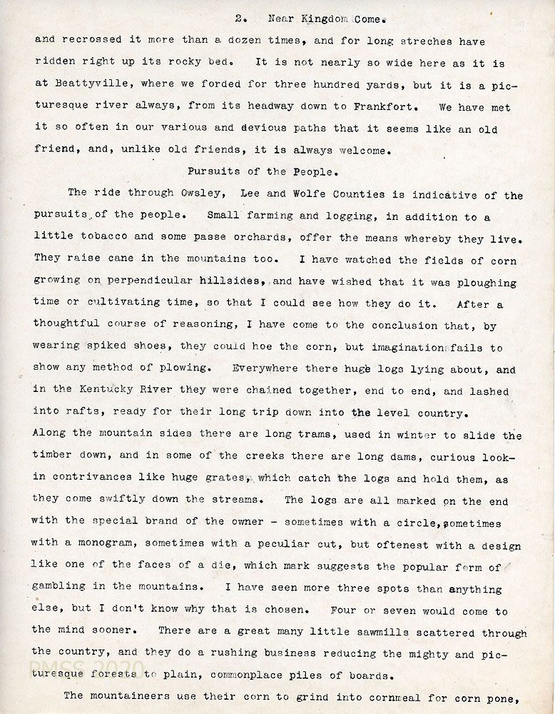 The ride through Owsley, Lee and Wolfe Counties is indicative of the pursuits of the people. Small farming and logging, in addition to a little tobacco and some passe orchards, offer the means whereby they live. They raise cane in the mountains too. I have watched the fields of corn growing on perpendicular hillsides, and wished that it was ploughing time or cultivating time, so that I could see how they do it . After a thoughtful course of reasoning, I have come to the conclusion that, by wearing spike shoes, they could hoe the corn, but imagination fails to show any method of plowing, Everywhere there [are] huge logs lying about, and in the Kentucky River they were chained together end to end, and lashed into rafts, ready for their long trip down into the level country.