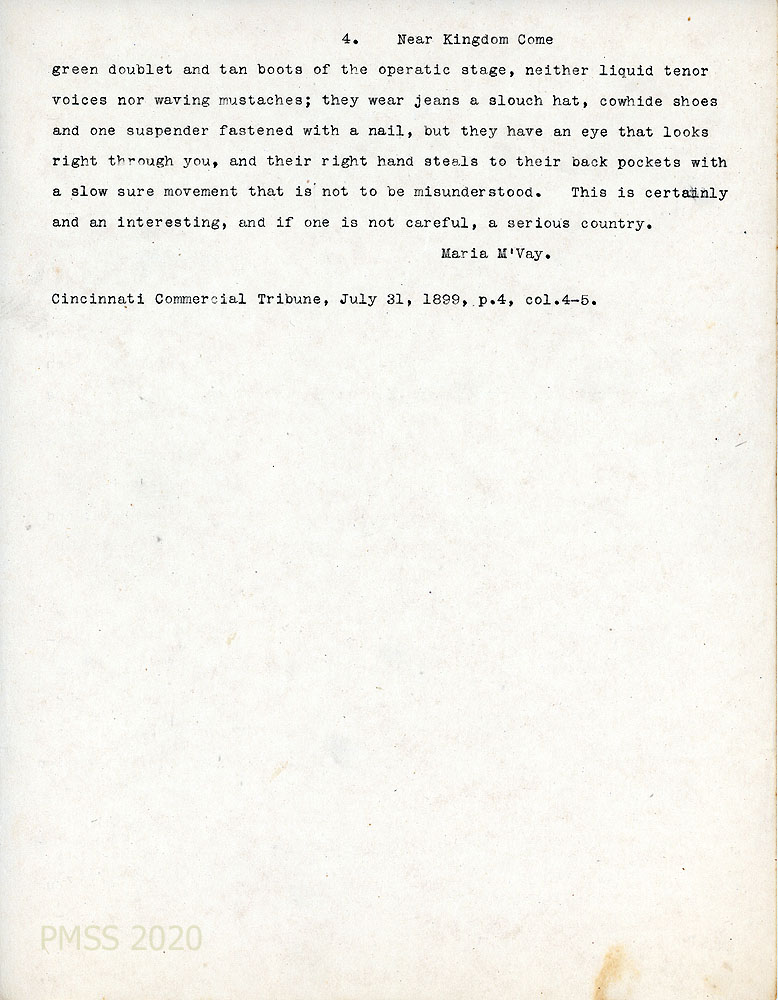 …green doublet and tan boots of the operatic stage, neither liquid tenor voices nor waving mustaches; they wear jeans a slouch hat, cowhide shoes and one suspender fastened with a nail, but they have an eye that looks right through you, and their right-hand steals to their back pockets with a slow sure movement that is not to be misunderstood This is certainly and [strike] an interesting, and if one is not careful, a serious country.