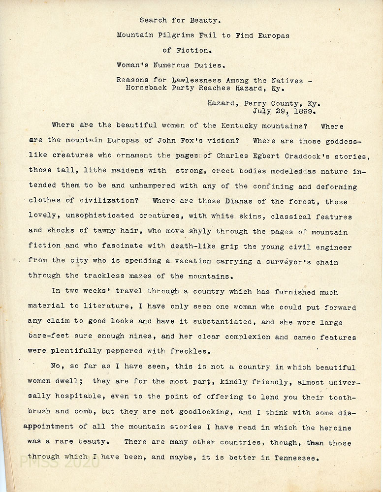 Where are the beautiful women of the Kentucky mountains? Where are the Mountain Europas of John Fox‘s vision? Where are those goddess-like creatures who ornament the pages of Charles Egbert Craddock‘s [ Mary Noailles Murfree (January 24, 1850 – July 31, 1922)] stories those tall, lithe maidens with strong, erect bodies modeled as nature intended them to be and unhampered with any of the confining and deforming clothes of civilization? Where are those Dianas of the forest those lovely unsophisticated creatures, with white skins, classical features, and shocks of tawny hair, who move shyly through the pages of mountain fiction and who fascinate with death-like grip the young civil engineer from the city who is spending a vacation carrying a surveyor’s chain through the trackless mazes of the mountains.