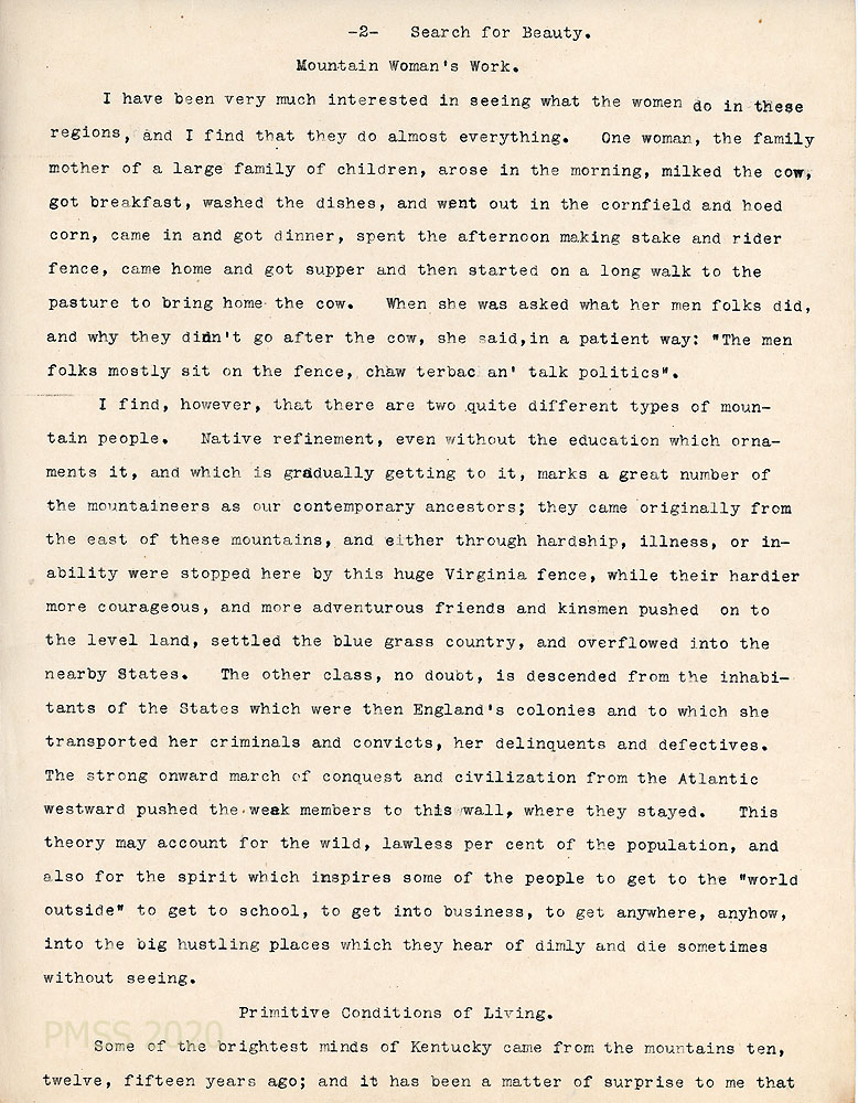 Hindman and Pine Mountain Settlement School were two of the earliest rural settlement schools in Kentucky, and Katherine Pettit envisioned both schools. The two schools, Hindman and Pine Mountain, owe their formation to Pettit’s extensive and deep first-hand knowledge of the eastern Kentucky geography and its people. This journey, recorded by the budding writer, Maria McVay, was a formative journey for Katherine Pettit, Maria McVay and their ecclectic traveling companions. While there were many later trips taken by Pettit deep into the remote areas of Eastern Kentucky, this trip and her companions clearly made this a formative experience in the adventurous and complex life of Katherine Pettit and her fellow travelers. In the early twentieth century, Pettit was not alone in seeking to know more about deep Appalachia and to understand the land, the resources, and the people of Eastern Kentucky.