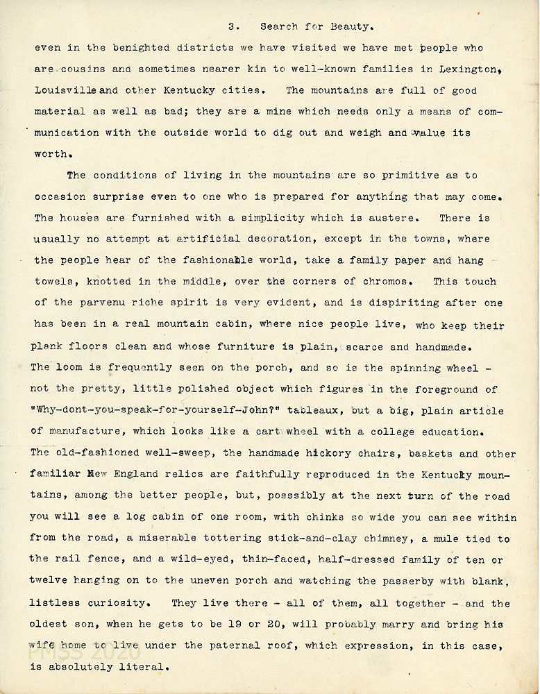 The complexity of this “excursion” comes through when compared to the account by Ellen Churchill Semple. In her account, written in 1901 and based on her observations and her research notes from “A Novel Excursion,” a more academic and controversial response may be found. Reading the people and landscapes of Eastern Kentucky is complex and the lighthearted account of McVay stands in contrast to the later ethnographic account of the journey written by Semple, whose writing about Appalachia has raised serious controversy. Other complex observations may possibly be found in the writing of some of the other travelers and will be published on this site if located. It is likely they would provide even more depth and variety regarding this amazing “excursion.”