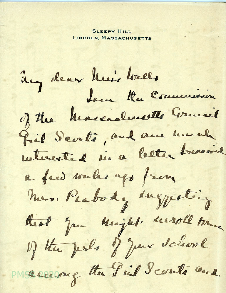 001-001d August 19, no year. Handwritten 4-page letter to Miss Wells from Helene(?) Storrow (Mrs. James J. Storrer) at “Sleepy Hill,” Lincoln, MA. [001] She is the Commission of the Massachusetts Council Girl Scouts; Mrs. Peabody suggested to her that PMSS might “enroll some(?) of the girls of your school among the Girl Scouts“; [001b] and is willing to suggest a captain(?); encloses literature; [001a] recommends Lucretia Garfield, daughter of the president of Williams College, and explains why she may be suitable; asks about financial arrangements; may be able to secure a playground worker; [001c] asks for information so she can find the appropriate person; she holds school for the training of officers and knows them well. [001d] Many women studied at Columbia and elsewhere but she knows of no list of those seeking positions.