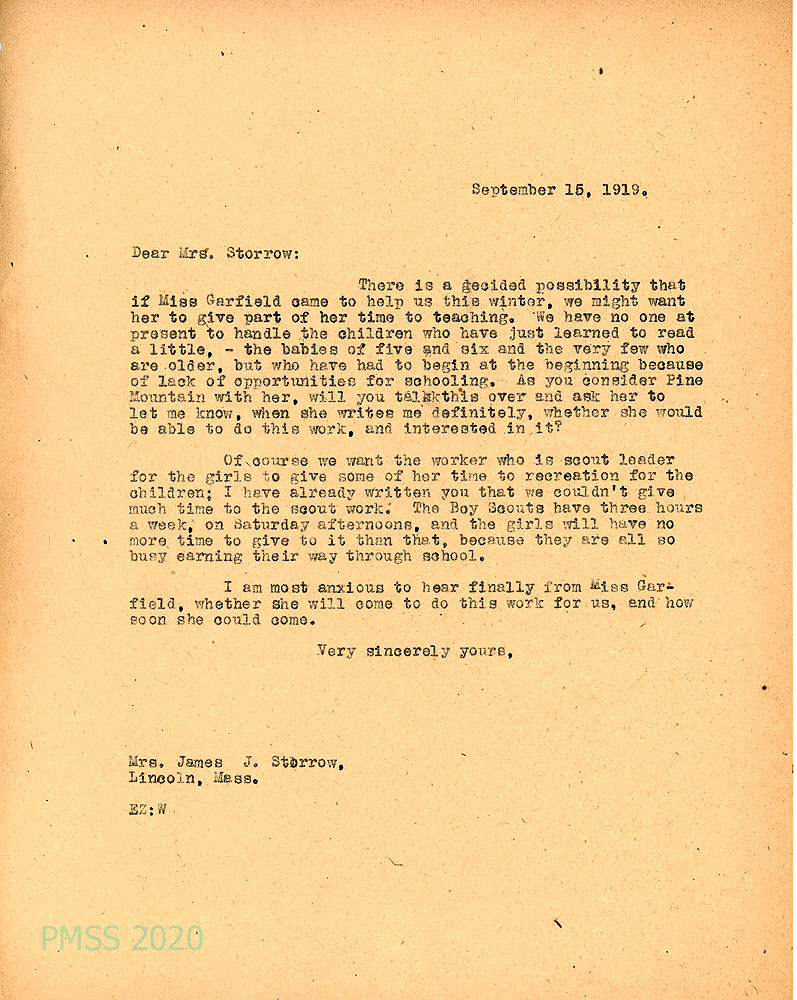 002 September 9, 1919. To Mrs. James J. Storrow from EZ (Ethel de Long Zande), who is interested in the Girl Scout literature and organizing the girls; only room for a volunteer; describes the girls’ needs; has met Miss Garfield; can provide living expenses only; volunteer must be adaptable to difficult weather and the “unexpected”; hopes Miss Garfield will come to PMSS soon.