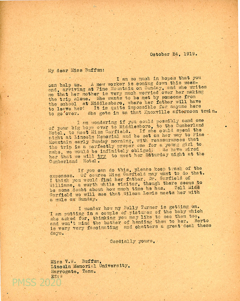 006 October 24, 1919. To Miss V.W. Buffum at Lincoln Memorial University, Harrogate, TN, from EZ. Asks Buffum to find someone to accompany Garfield when she arrives at Middlesborough. William Lewis will meet her with a mule. Asks about Polly Turner; encloses photos; mentions Berto.