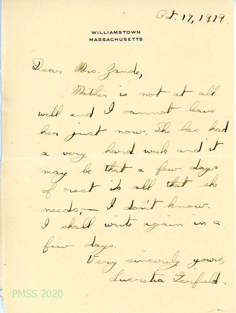 010 October 17, 1919. Handwritten note to Mrs. Zande from Lucretia Garfield, who must stay home a few days longer with her mother who “has had a very hard week….”