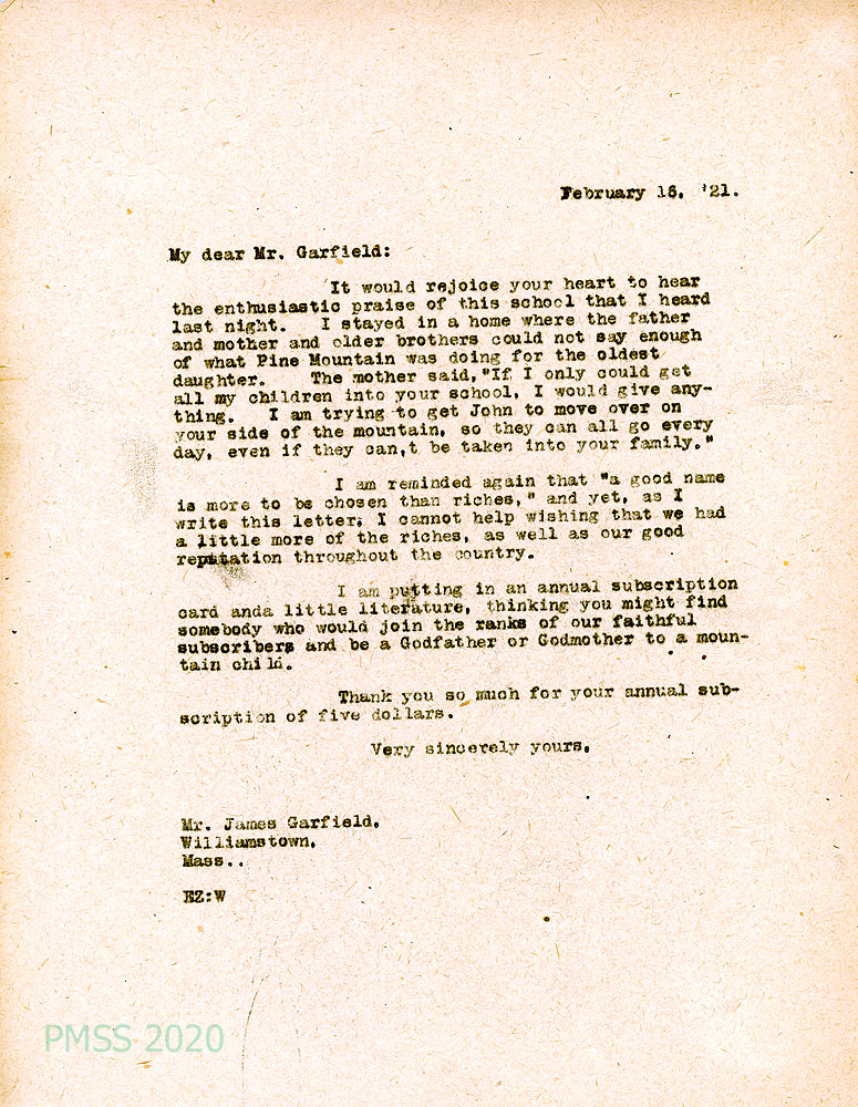 016 February 16, 1921. To Mr. James Garfield in Williamstown, MA, from EZ, who thanks him for his $5 annual subscription; encloses a subscription card and literature for others.