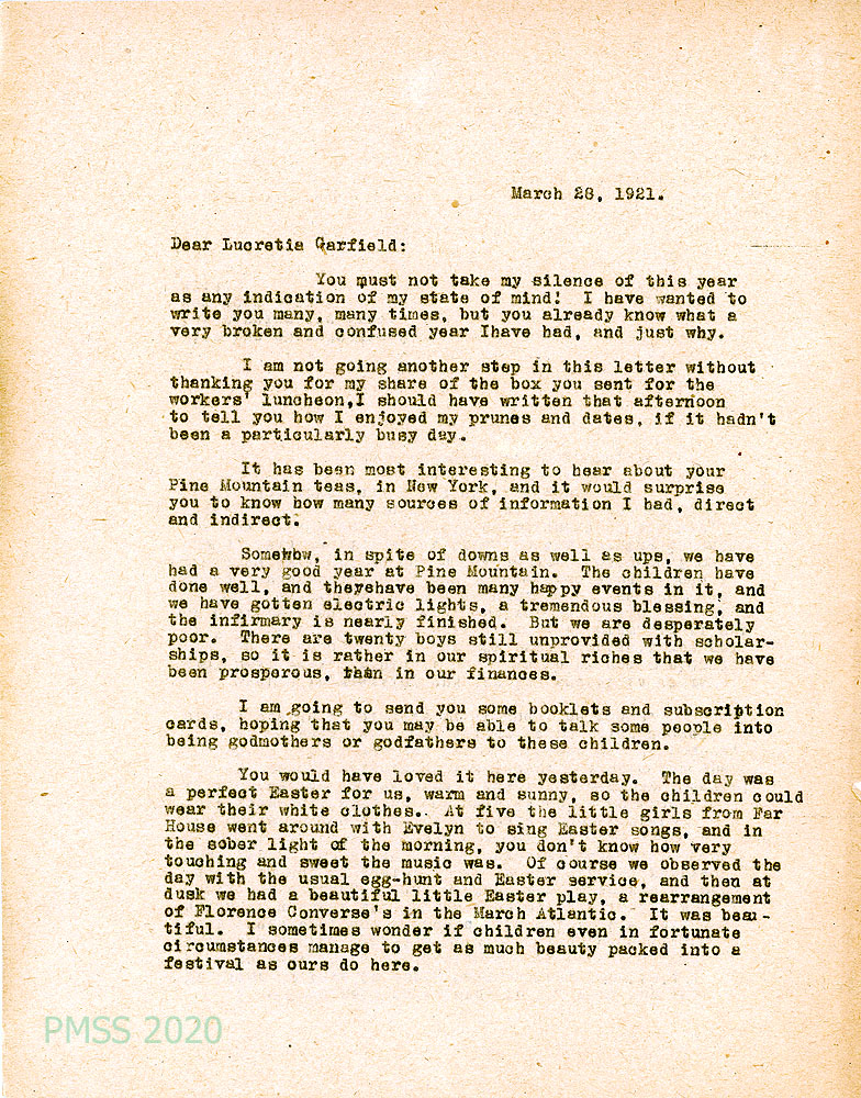 017 March 28, 1921. Two-page letter to Lucretia Garfield in New York City from EZ, [017] who hasn’t written because of her “very broken and confused year…” Thanked her for EZ’s share of the workers’ luncheon box; interested in Garfield’s reports of Pine Mountain teas in New York. Describes PMSS’s “very good year,” including getting electric lights and a nearly finished infirmary, but the school is “desperately poor” financially; Encloses fundraising material for those who wish to be godmothers or godfathers to the children. Described Easter celebration on the campus; singing, egg-hunt, Easter service, and an Easter play. “I sometimes wonder if children even in fortunate circumstances manage to get as much beauty packed into a festival as ours do here.” [017a] EZ expresses interest in the work at Williams College; regrets how difficult it is to get “first-hand facts.” Evelyn to attend the Knoxville Conference; describes her ideas for May Day.