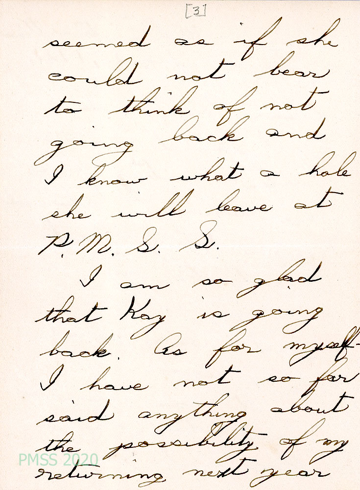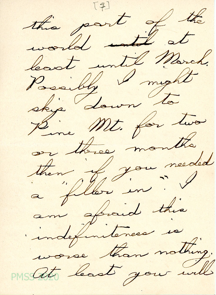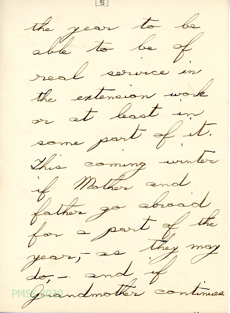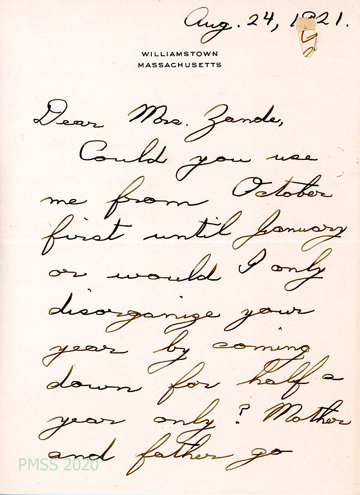 021-021f July 26, 1921. Eight-page handwritten letter to Mrs. Zande from Lucretia. [021] Assures Zande that her bill was paid. [021a] Enjoyed visiting with Kay and Ethel Wright, who won’t be returning to PMSS next year [021b] but Kay will be returning. [021c] Garfield is still indefinite about returning to PMSS; [021d] is interested in serving at the extension center. [021e] She may be able to come to PMSS if her parents go abroad [021f] and fill in for a few months. [021g] Confirms Grandmother Mason’s address.