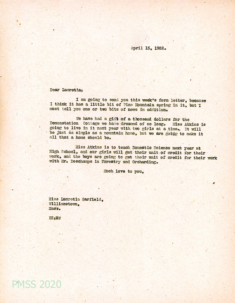 027 April 15, 1922. To Lucretia in Williamstown, MA, from EZ. Encloses the week’s form letter [Dear Friend letter?]; received $1000 gift for the Demonstration Cottage (Practice House?), where Miss Atkins and two girls will live. Atkins will teach Domestic Science at the high school which gives the girls units of credit for their work; same with the boys under Mr. [Leon] Deschamps in Forestry and Orcharding.