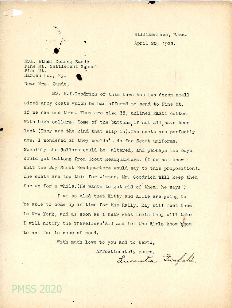 039 April 20, 1922. Typewritten letter to Mrs. Zande from Lucretia Garfield. Mr. E.I. Goodrich of Williamstown, MA, offers 2 dozen army coats to PMSS.