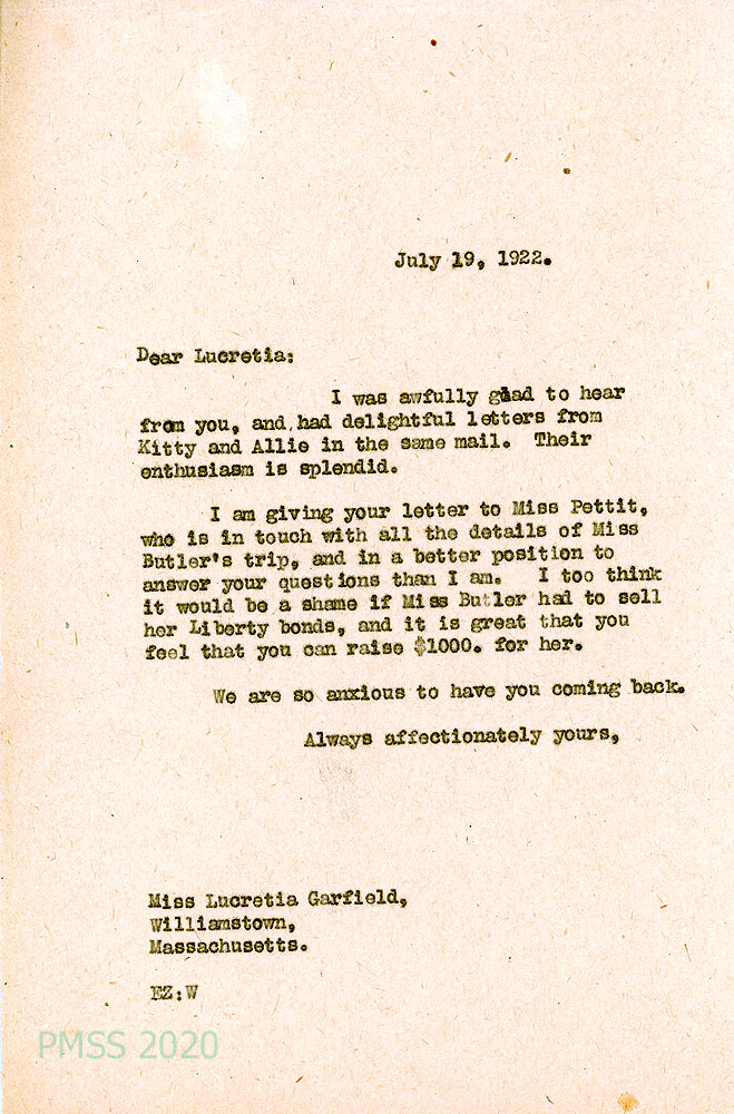 040 July 19, 1922. To Lucretia from EZ. Miss [Marguerite] Butler’s trip and need for funds, which Garfield offered to raise.