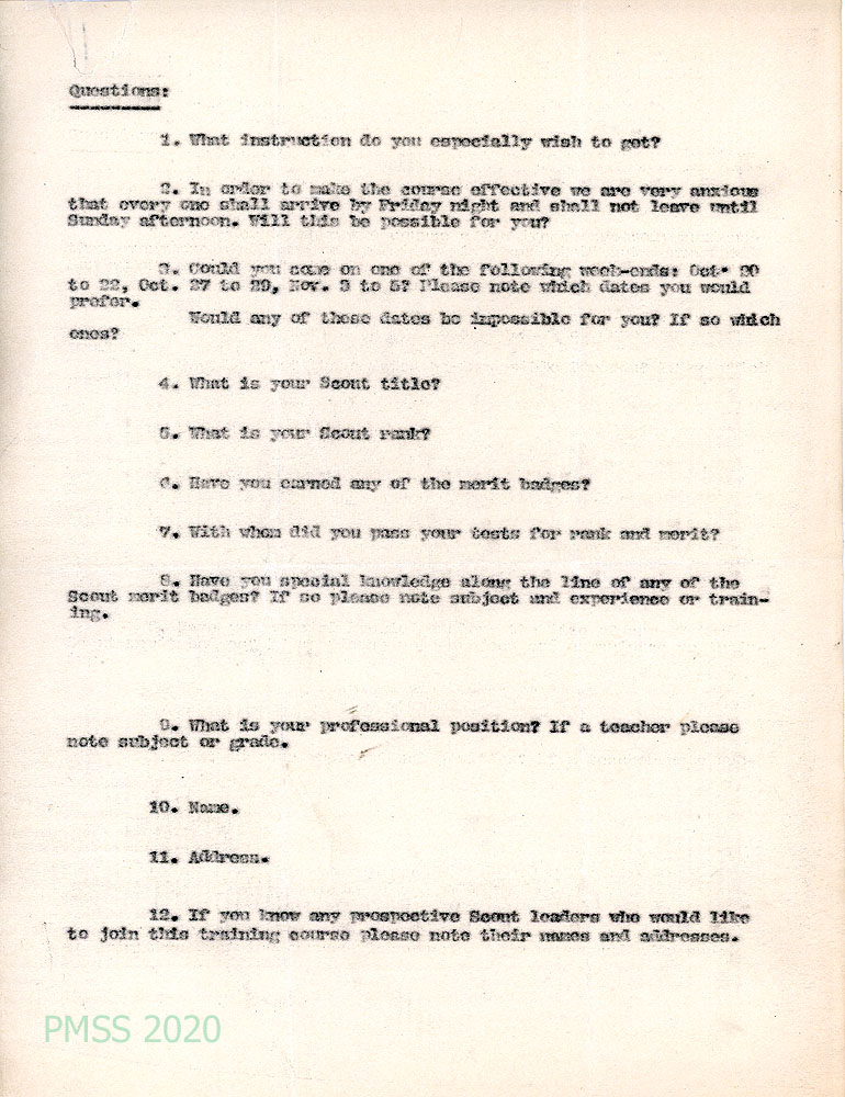 044 N.D. Carbon copy of a typewritten list of questions for Scout leaders who wish to attend a training course.
