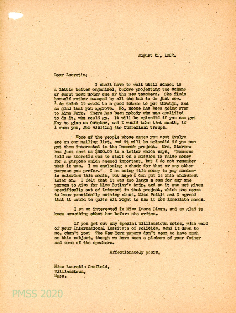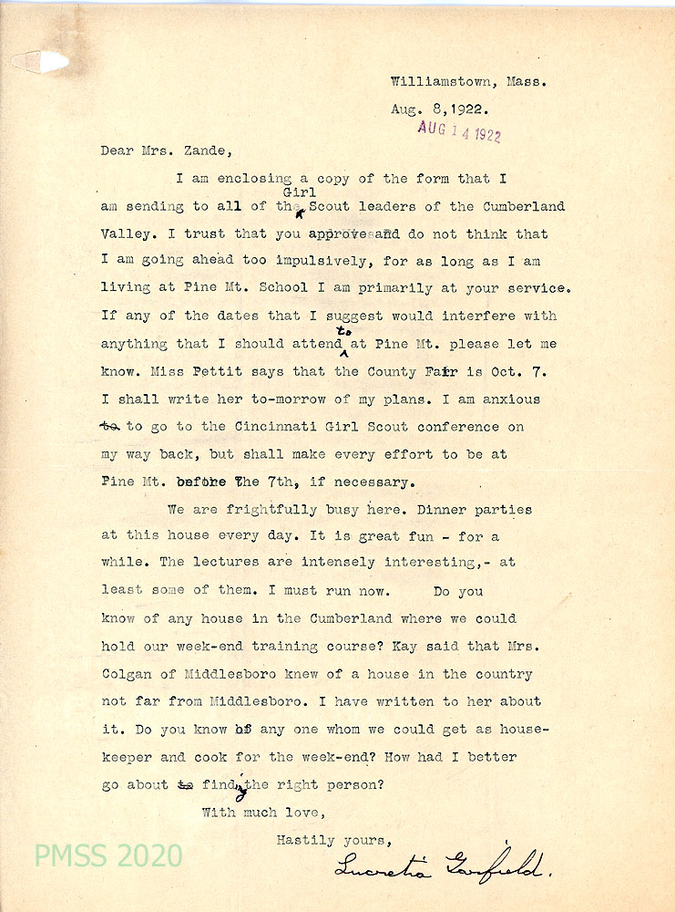 050-050a August 19, 1922. Two-page typewritten letter to Mrs. Zande from Lucretia Garfield. [050] Agrees to the training of a new worker to act as leader of the PMSS Girl Scouts under Garfield’s supervision. P.S., Miss Laura Dixon, Principal of the Center School, West Hartford, CT, [050a] offers to visit or work at PMSS next summer.