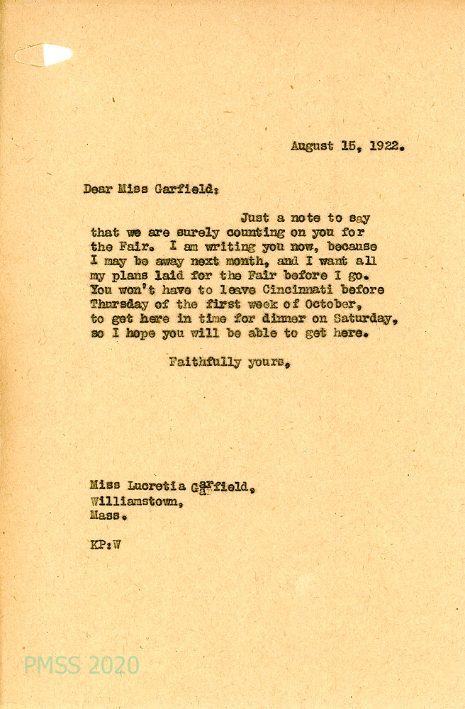 048 August 9, 1922. Typewritten letter to Miss Pettit from Lucretia Garfield. Received news that the girls returned to PMSS safely and of Miss Storer’s visit; plans to attend the Girl Scout conference in Cincinnati at the National Training Camp.