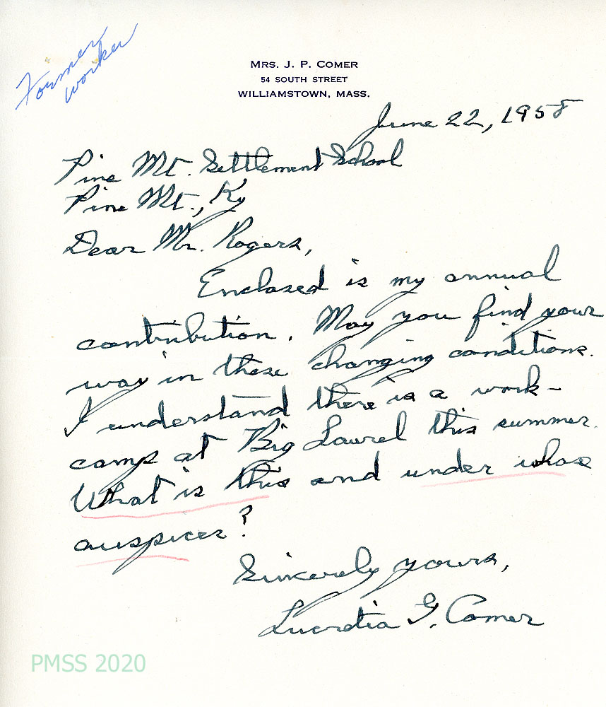 127 June 27, 1958. To Mrs. Comer from Burton Rogers, Director, who thanks her for her $5 gift and “faithful interest in Pine Mountain Settlement School.” Describes the work camp group at Big Laurel, which is under the Community Dynamics program of Earlham College, Richmond, IN. “This is the second summer that they have, in cooperation with Berea College, sent a group of students to work on community projects with the fold at Big Laurel and other communities in this area.” Rogers further explains the mission and operation of the camp and examples of the students’ work. “The group lives in the Community House which Pine Mountain owns, at the Big Laurel Medical Settlement.”