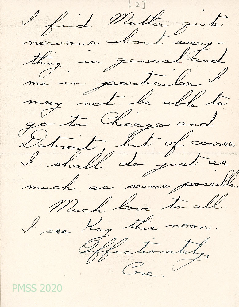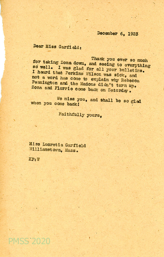 087 December 6, 1923. To Miss Garfield from KP, who thanks her “for taking Zona down…” Mentions Perkins Wilson, Rebecca Pennington, the Madons and Florrie.