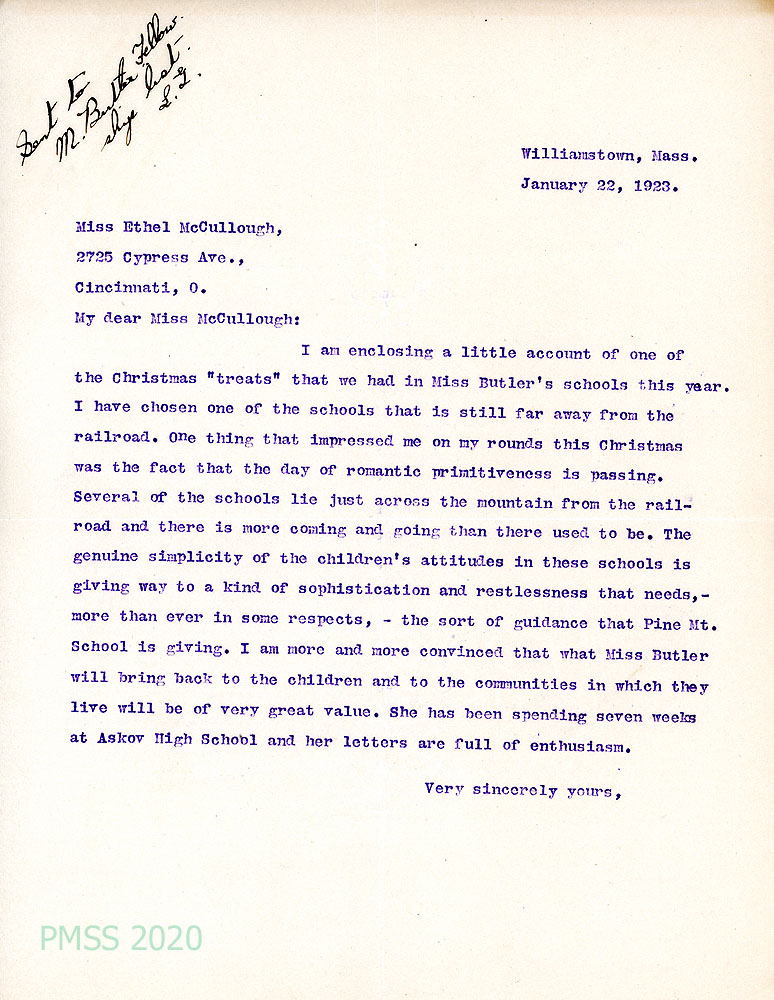 060 January 22, 1923. To Miss Ethel McCullough in Cincinnati, OH from [unsigned, likely Garfield] in Williamstown, MA. Encloses the account of the Christmas “treats’ at Miss Butler’s schools. [See 059.] She writes: One thing that impressed me on my rounds this Christmas was the fact that the day of romantic primitiveness is passing. Several of the schools lie just across the mountain from the railroad and there is more coming and going than there used to be. The genuine simplicity of the children’s attitudes in these schools is giving way to a kind of sophistication and restlessness that needs – more than ever in some respects – the sort guidance that Pine Mt. School is giving. I am more and more convinced that what Miss Butler will bring back to the children and to the communities in which they live will be of very great value. …..” Notation upper left of page: “Sent to M. Butler Fellowship list. L.G.”