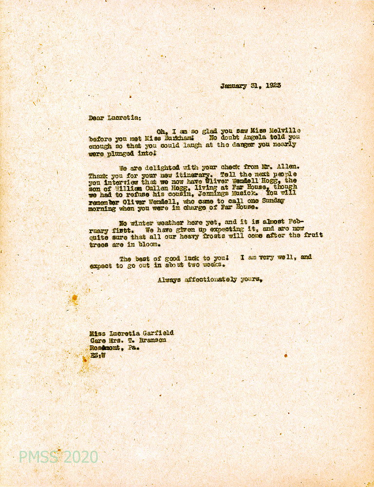 062 January 31, 1923. To Lucretia (℅ Mrs. T. Branson, Rosemont, PA) from EZ. “…[W]e now have Oliver Wendell Hogg, the son of William Cullen Hogg, living at Far House, though we had to refuse his cousin, Jennings Musick. You will remember Oliver Wendell, who came to [visit]….when you were in charge of Far House.”