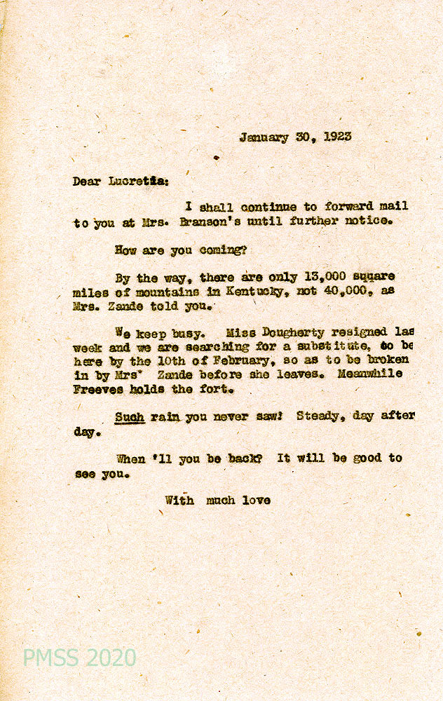 063 January 30, 1923. To Lucretia from [unsigned, likely EZ]. PMSS updates: Miss Dougherty resigned last week. “Meanwhile, Freeves holds the fort.”