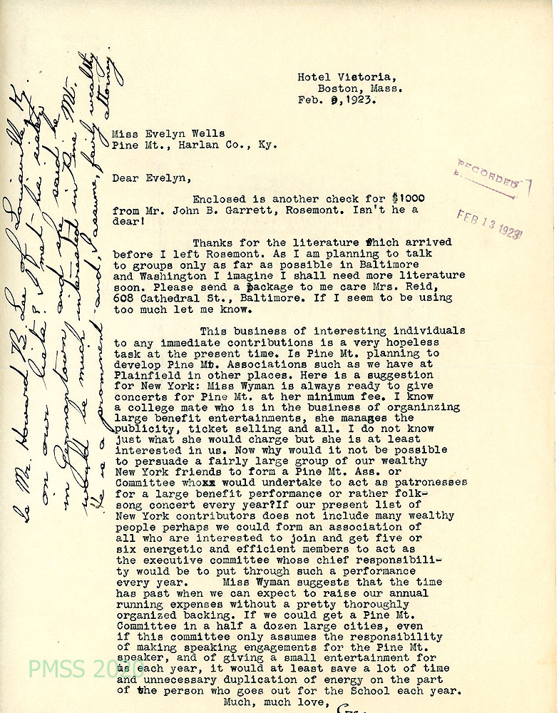 064 February 9, 1923. Typewritten letter to Evelyn Wells at PMSS from Lucretia at Hotel Victoria, Boston, MA. Encloses $1000 donation from Mr. John B. Garrett. Asks for additional literature for her talks to groups in Baltimore and Washington. She provides fundraising ideas, such as a Pine Mt. Association in several large cities to assist with fundraising activities. Notation along left margin: Suggests Mr. Howard B. Lee of Louisville, KY, as a prospective donor.