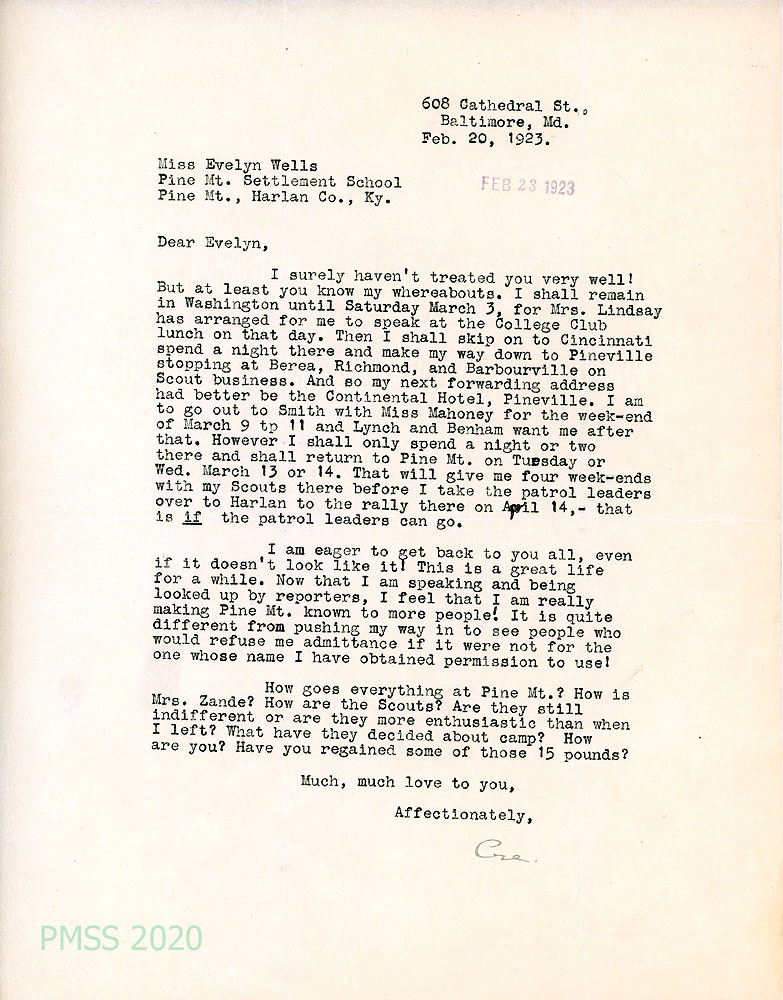 066-066a February 20, 1923. Two-page typewritten letter to Evelyn [K.Wells] from “Cre” (Lucretia). In Baltimore, MD. Describes her travel plans for Scout business and fundraising (Washington, Cincinnati, Berea, Richmond, Barbourville, Pineville), returning to PMSS mid-March, in time for the rally in Harlan. “Now that I am speaking and being looked up by reporters, I feel that I am really making Pine Mt. known to more people!”