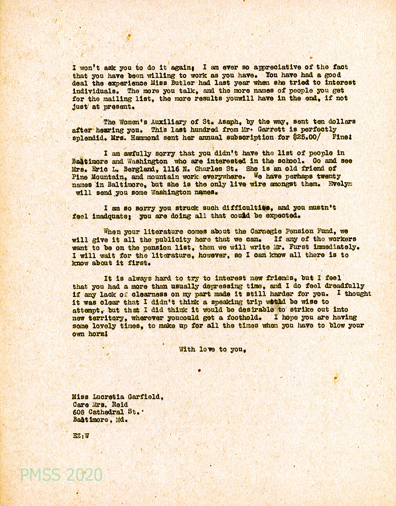 072-072a February 13, 1923. To Lucretia, ℅ Mrs. Reid in Baltimore, MD, from EZ, [072] who is sorry Lucretia is having problems with fundraising and for her misunderstanding of EZ’s advice. EZ then describes the steps toward giving speaking presentations; letters, appointments, announcements, committees, all done before leaving PMSS for the tour. Pine Mountain Associations have thrived in some cities (Plainfield because of Evelyn and Montclair because of EZ’s friends there) and not others. EZ assures Lucretia that her individual meetings are “very worthwhile.” [072a] EZ gives additional fundraising advice; mentions Miss Butler’s experiences; mentions other recent donors. Suggest that Lucretia visit Mrs. Eric L. Bergland in Boston, “an old friend of Pine Mountain.” EZ will publicize the literature Lucretia will send about the Carnegie Pension Fund.