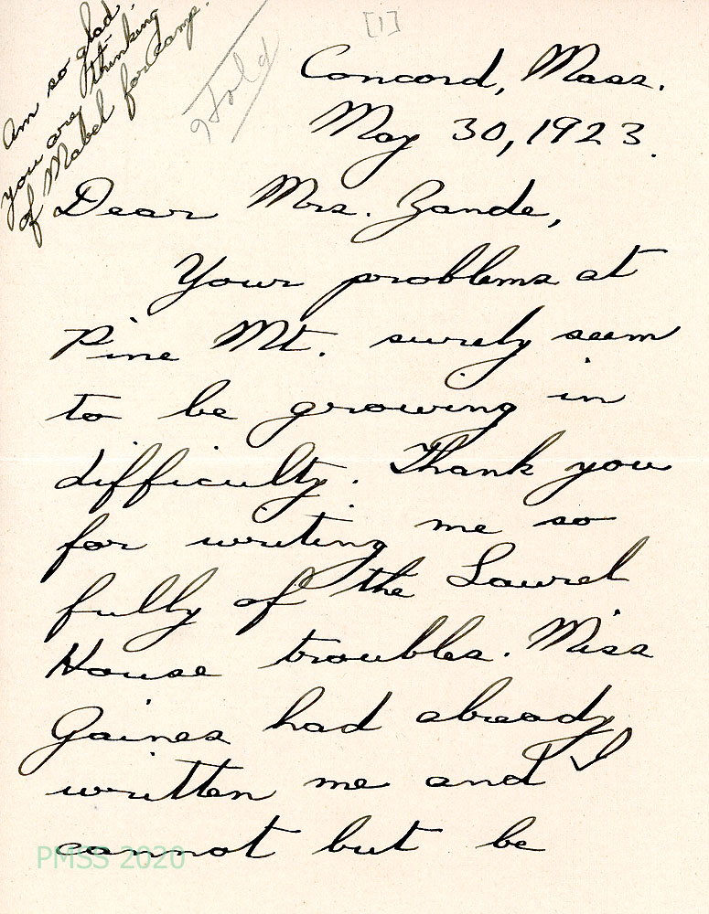 078-078c May 30, 1923. Handwritten 4-page letter to Mrs. Zande from Lucretia in Concord, MA. [078] Thanks Zande for sending details about “the Laurel House troubles…” Lucretia had written Miss Gaines, enclosing a letter to be forwarded to Mr. Howard.