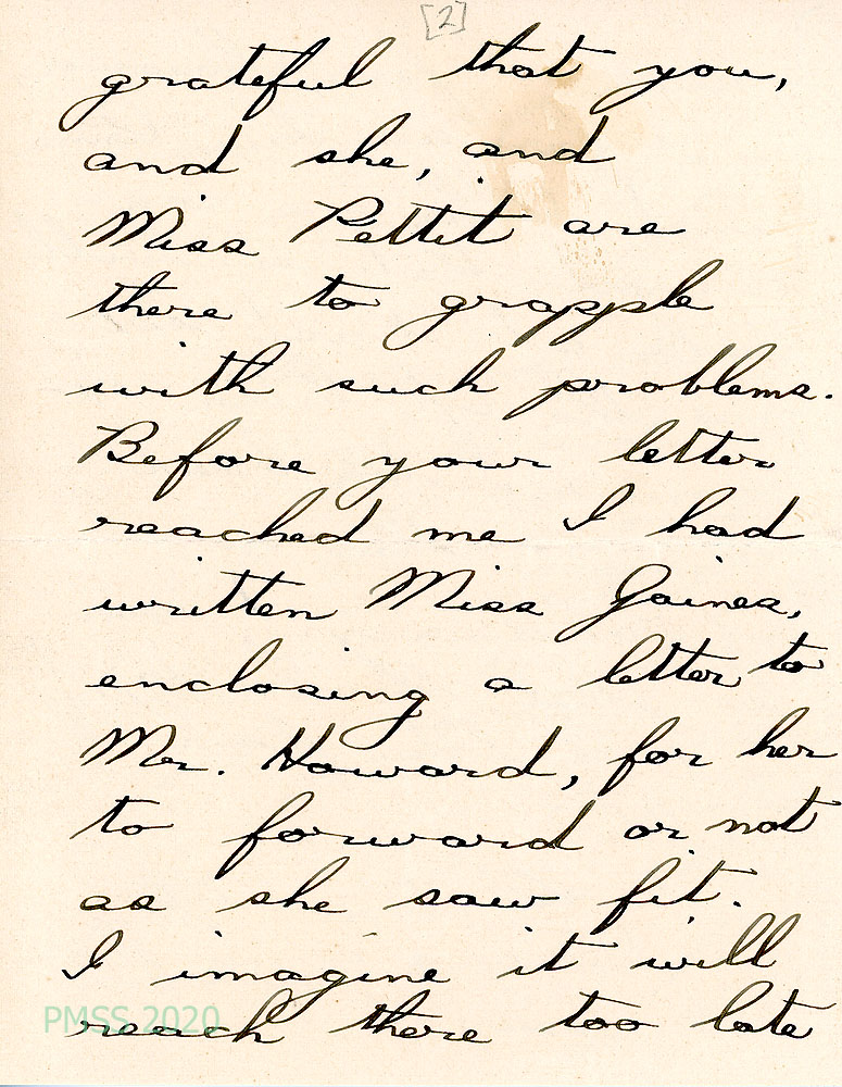 [Note: All letters from PMSS staff are carbon copies, typewritten and unsigned that are meant for the Office files. The initials at the bottom left of most PMSS letters indicate the writer (along with initials of the secretary). For example “EZ” are the initials of Ethel de Long Zande, “KP” refers to Katherine Pettit, and “EKW” to Evelyn K. Wells. The transcriptions are in chronological order and not necessarily in order of the image numbers.]