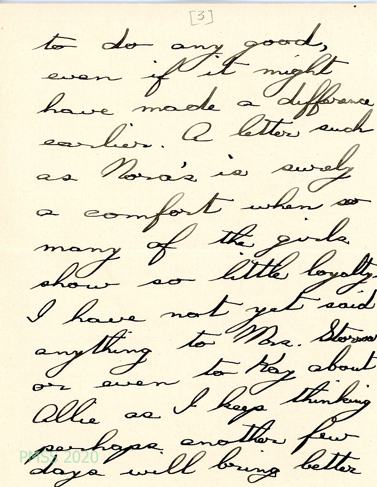 [078b] Nora [Howard]’s letter “is surely a comfort when so many of the girls show so little loyalty.” [078c] Concerned that Fair Anna and Allie will take “at least six months of bitter experience to break through those walls of obstinacy.” Received a letter from Clara Siler. Eager to see Berto’s little sister.