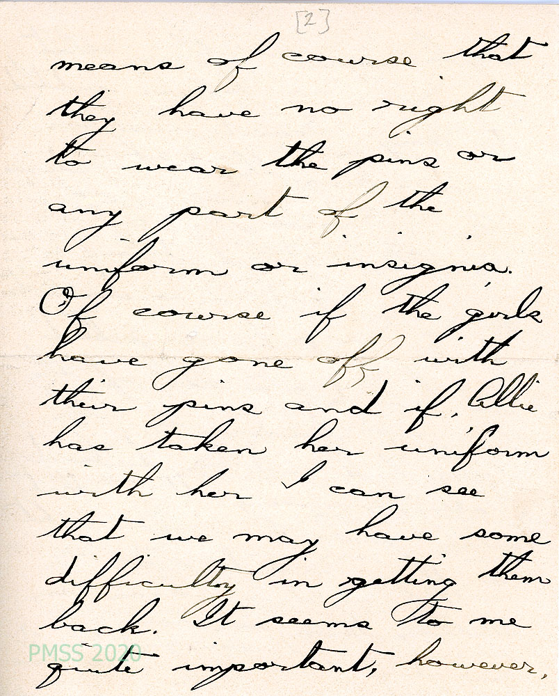079 June 21, 1923. To Lucretia in Boston, MA, from EZ. “Both girls (Fair Annie and Allie) are estranged from the School and as far as we know, feeling bitter and hard.” EZ hopes their feelings will pass by Fall. The girls left their uniforms behind and PMSS shouldn’t ask for their badges yet.