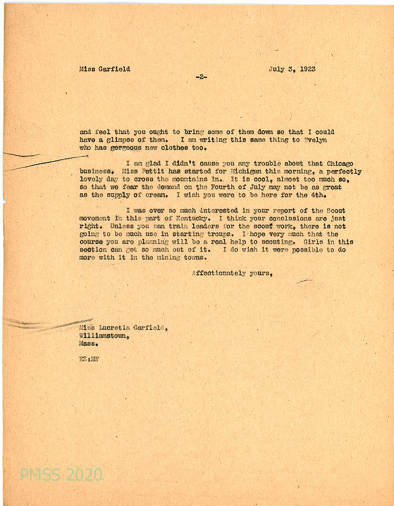 084-084a July 3, 1923. Two-page letter to Lucretia in Williamstown, MA, from EZ. [084] Agrees that PMSS should have a Scout Captain. Mentions Miss Baber, Miss Dunbar, Ethel Wright, Evelyn Wells. [084a] Agrees that Scout leaders must be trained before starting troops; that scouting is good for this part of Kentucky.