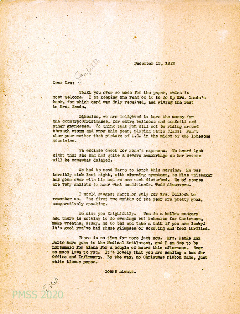 088 December 13, 1923. To “Cre” [Lucretia] from [unsigned]. Thanks Lucretia for the ream of paper and money and items for the country Christmases. Encloses check for Zona’s expenses. Mentions Harry, Miss Whittaker, Dr. Todd at Lynch, Mrs. Bullock.