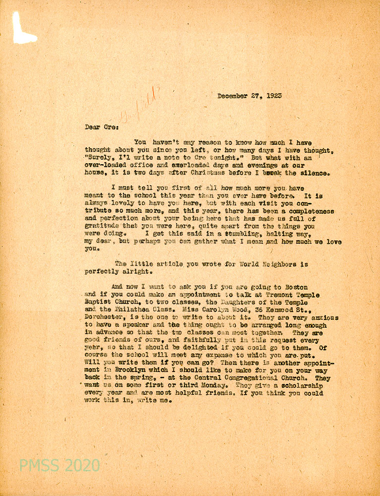 089-089a December 27, 1923. To “Cre” from [truncated]. Expresses appreciation of Lucretia’s visits to PMSS and how much the School loves her. Mentions an article Lucretia’s wrote for World Neighbors. Asks Lucretia to make speaking appointments with two classes at the Tremont Temple Baptist Church in Boston which are PMSS friends. Also, at the Central Congregational Church in Brooklyn, who give PMSS an annual scholarship. [truncated]